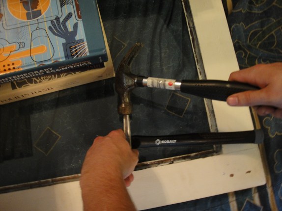 Step 3: Hammer the finishing nails into the wood just above the glass. We did this as extra insurance, in the event that the adhesive didn’t hold up as well as we hoped. Also, my husband used a finishing hammer to make contact with the nail, but actually hammered it in with the second hammer so there was less risk of damaging the glass. As extra, extra insurance, we also ran a bead of silicone around the glass.