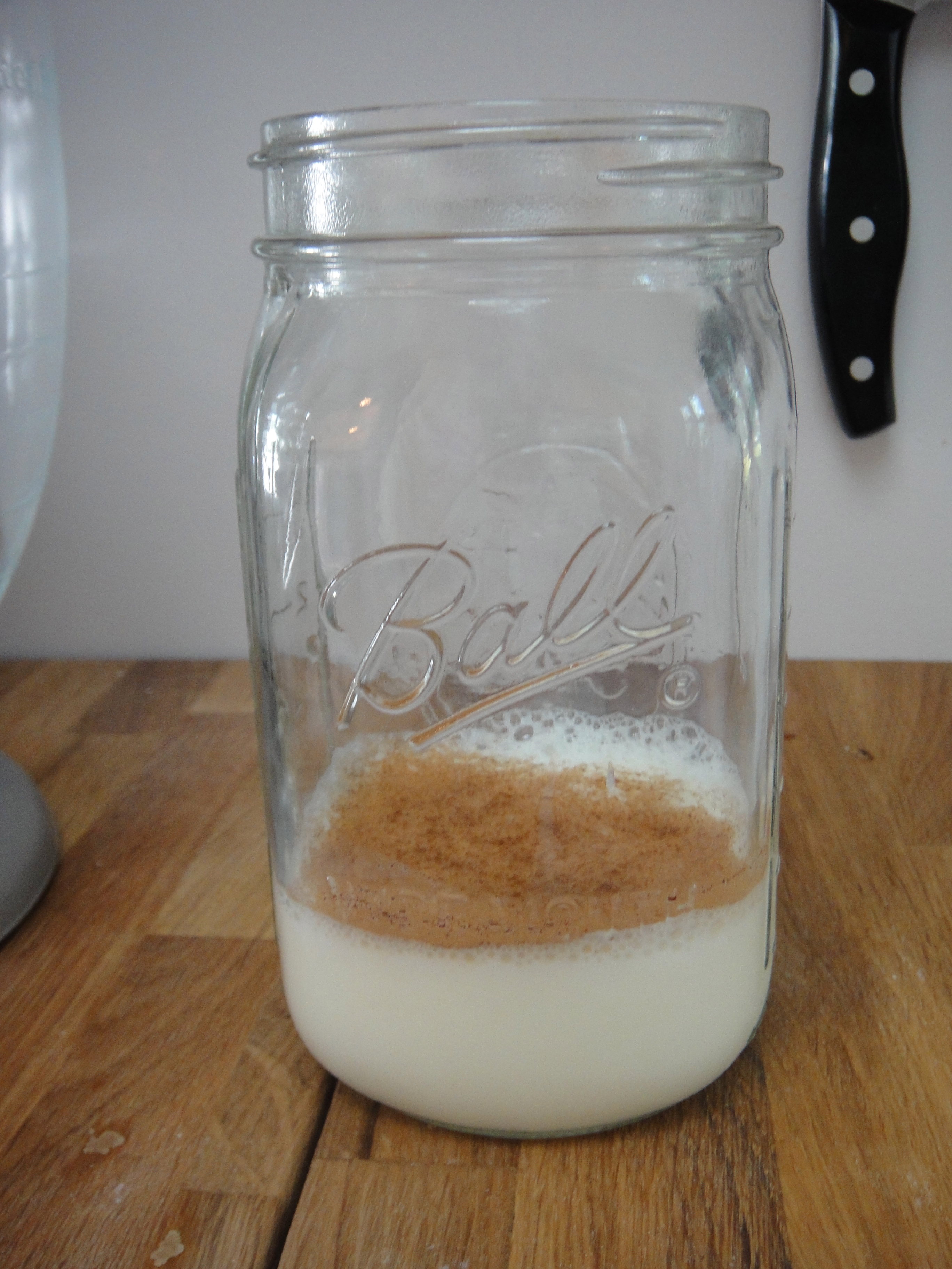 First, pour a cup of milk into a glass jar. (I use 1%.)