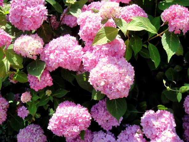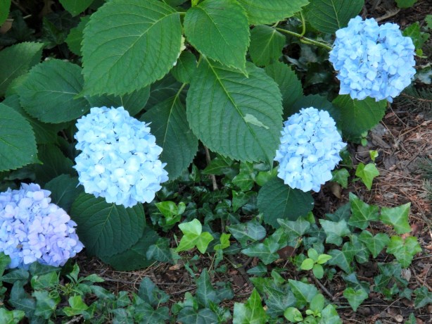 {hydrangeas under the pines, the soil acidity causes that bright blue color}