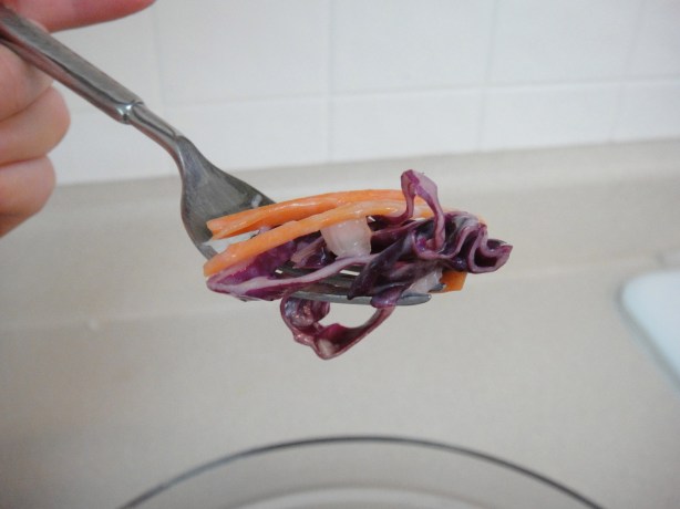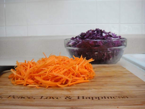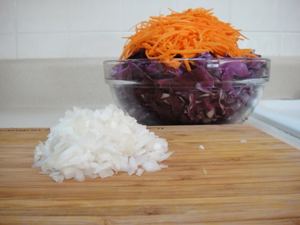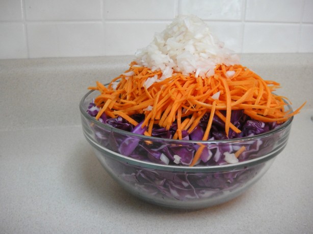 First, chop your cabbage. I like to leave it in pretty big pieces so it feels more like a salad, plus it doesn’t get soggy like some of the finely chopped varieties do. Also, I don’t really know if it makes a difference, but I use a ceramic knife when I cut things like lettuce and cabbage. I’ve heard that using a metal knife makes the leaves brown more quickly.