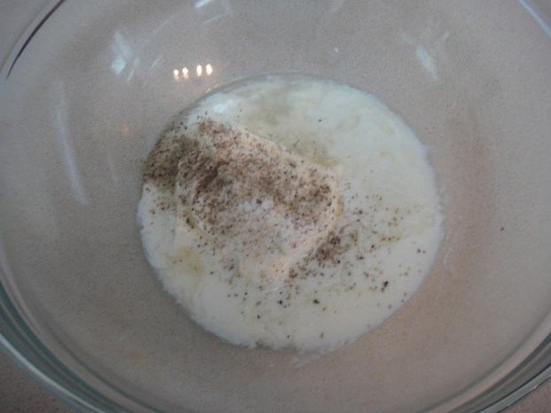 Next it’s time to mix your seasonings and wet ingredients. Milk, lemon juice, mayonnaise, white vinegar, salt, pepper and sugar.