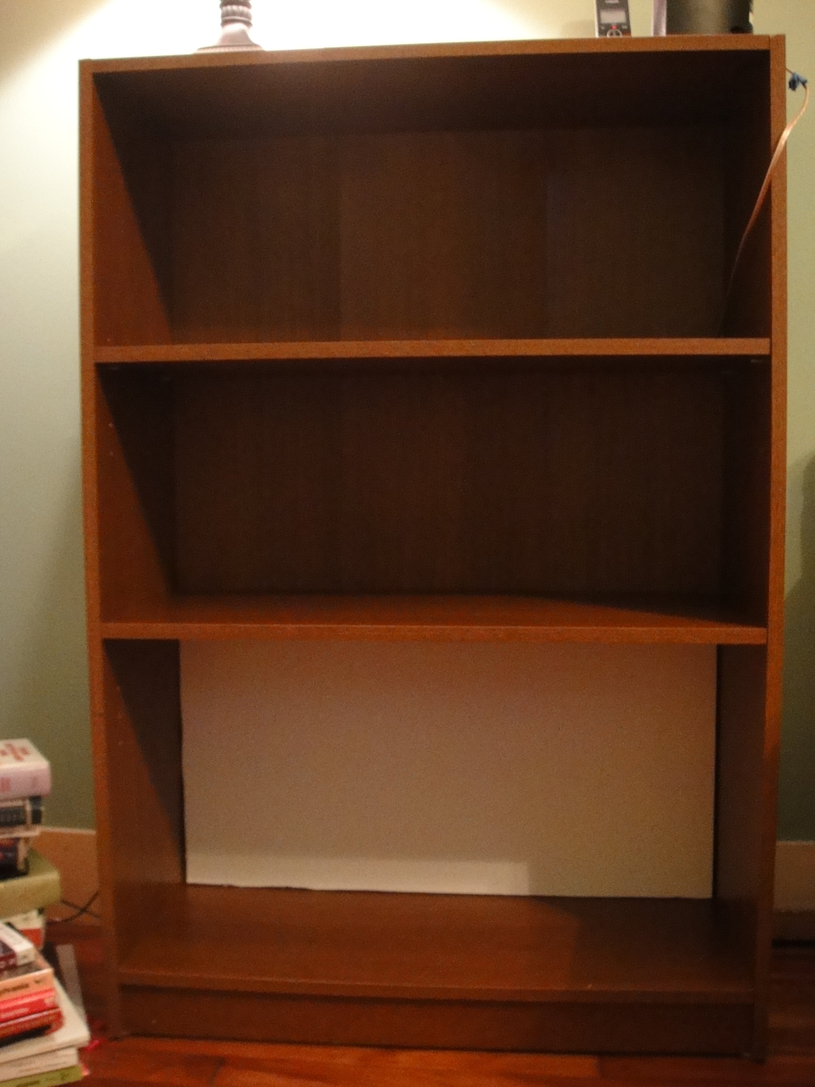 I repeated the process two more times for the middle and upper shelf. The only difference on the upper shelf is that I cut a small hole in the corner of the board so the cord for the speaker would still fit through the bookshelf backing.