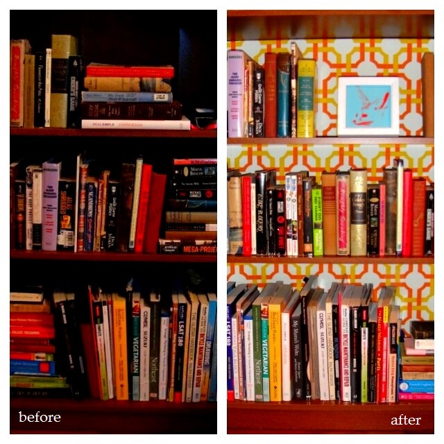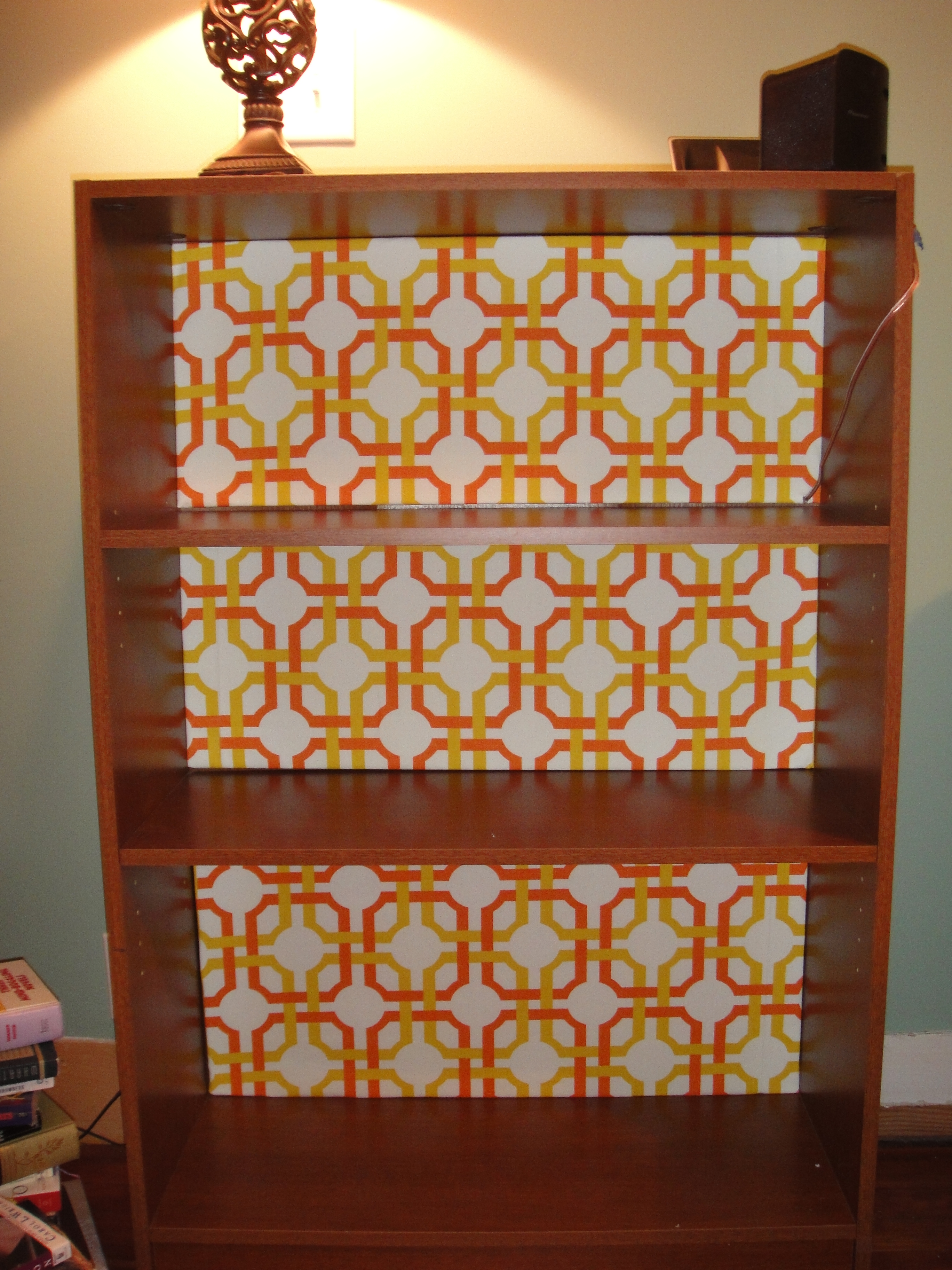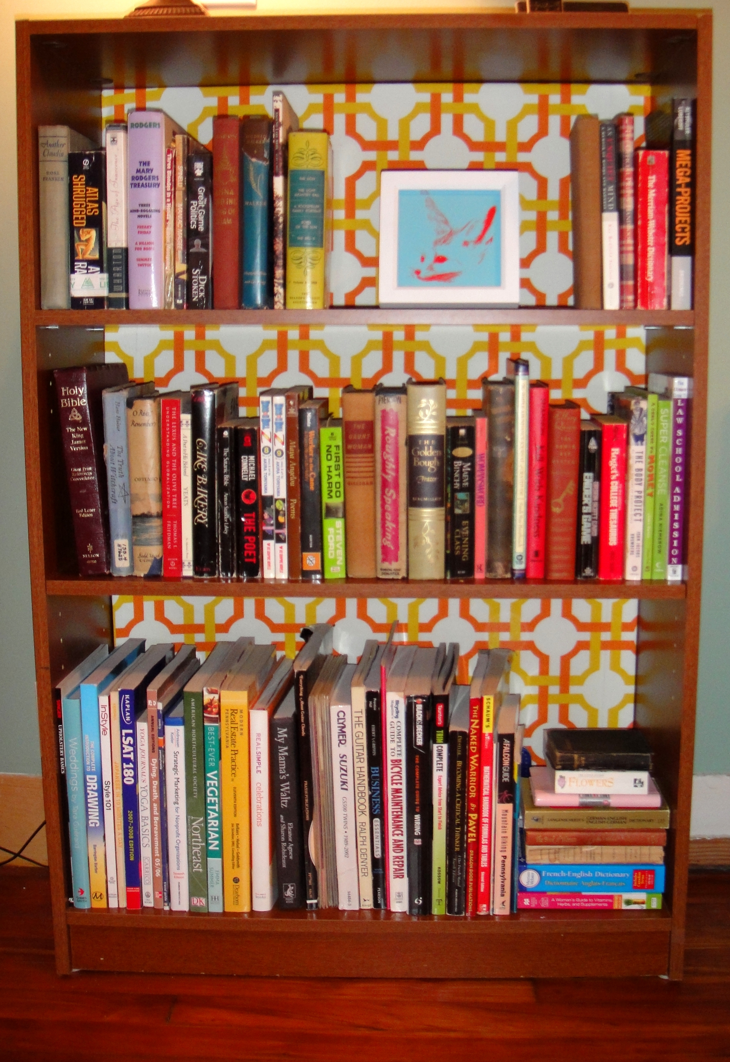 This project took around two hours and cost me about $15. Using this bold patterned fabric was a simple way to breathe new life into a hand-me-down bookcase.