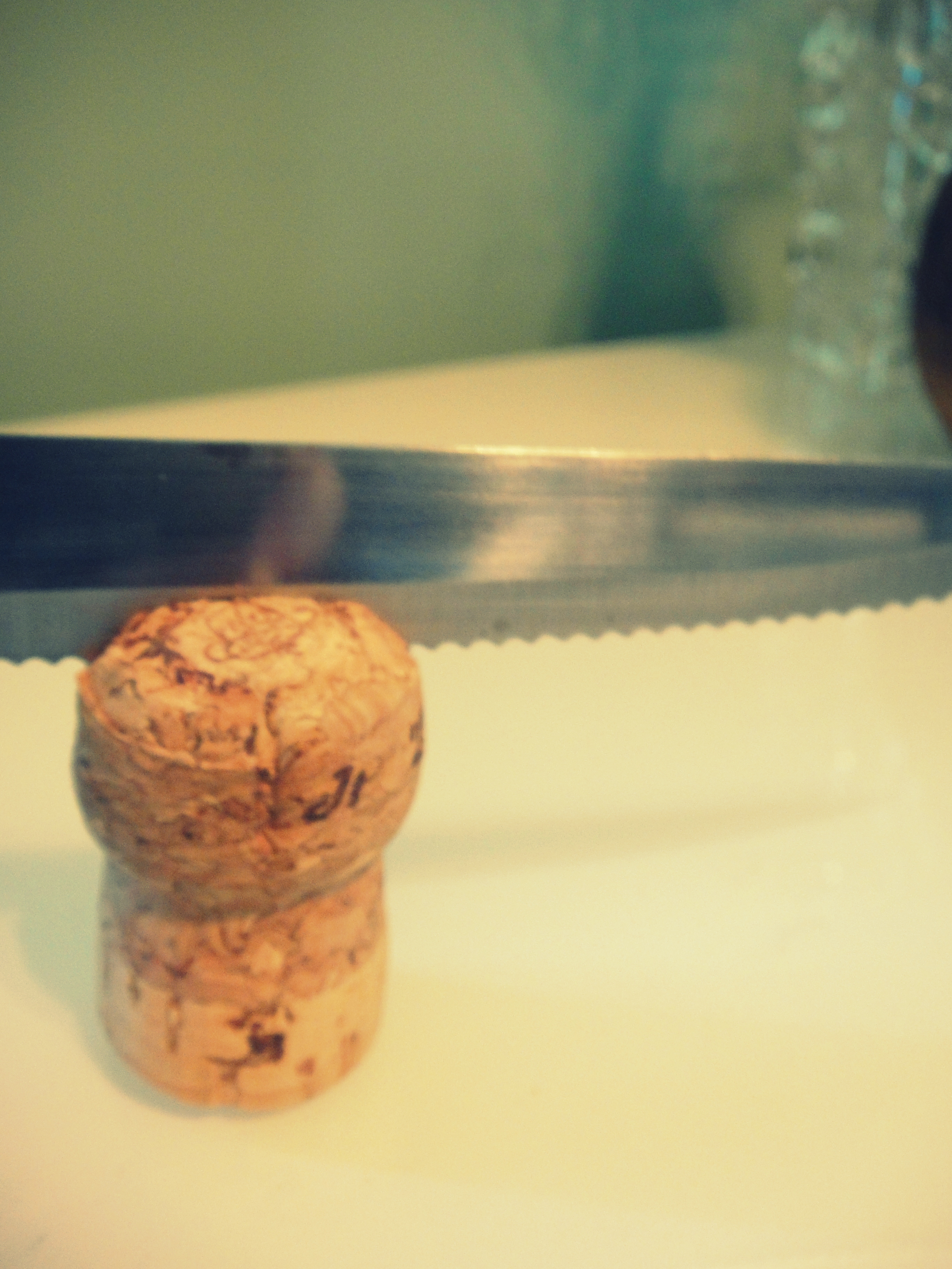 Then, take a serrated knife and start sawing in a straight line in the center of the cork.
