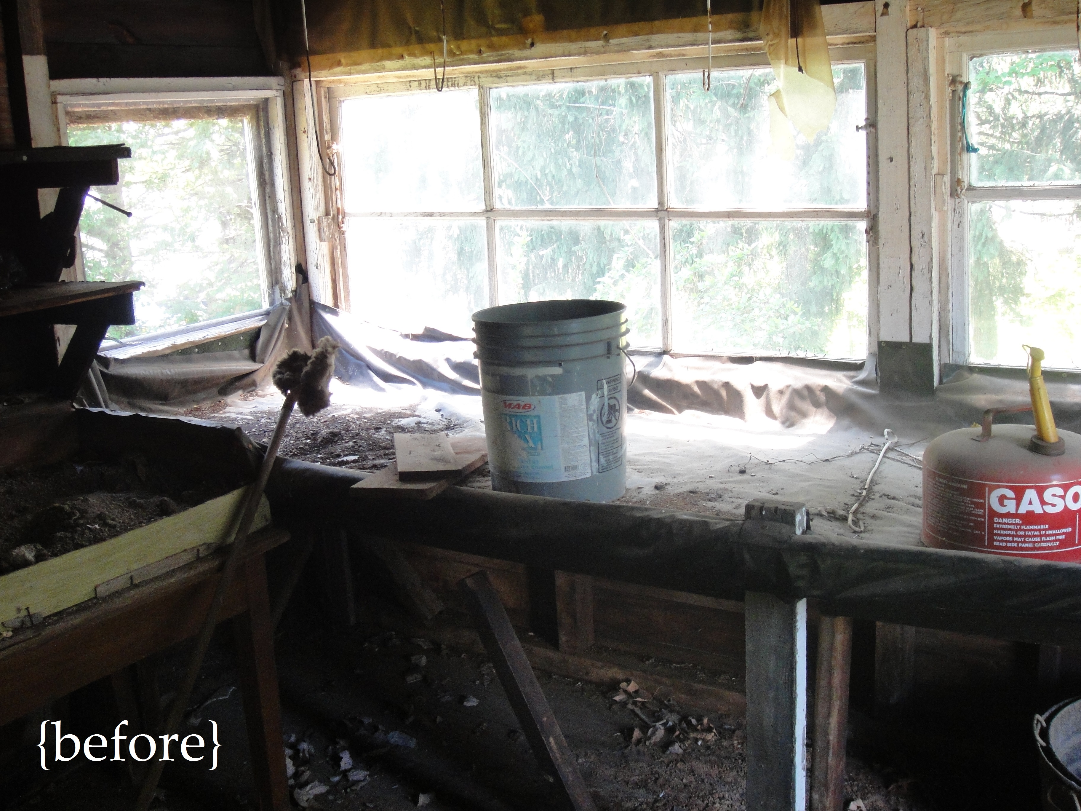 Here’s the other side of the 12′ x 12′ building. Oh, that a-frame building with the stains and old windows stacked next to it? Ignore that. It’s just our garage, we’re getting to it.