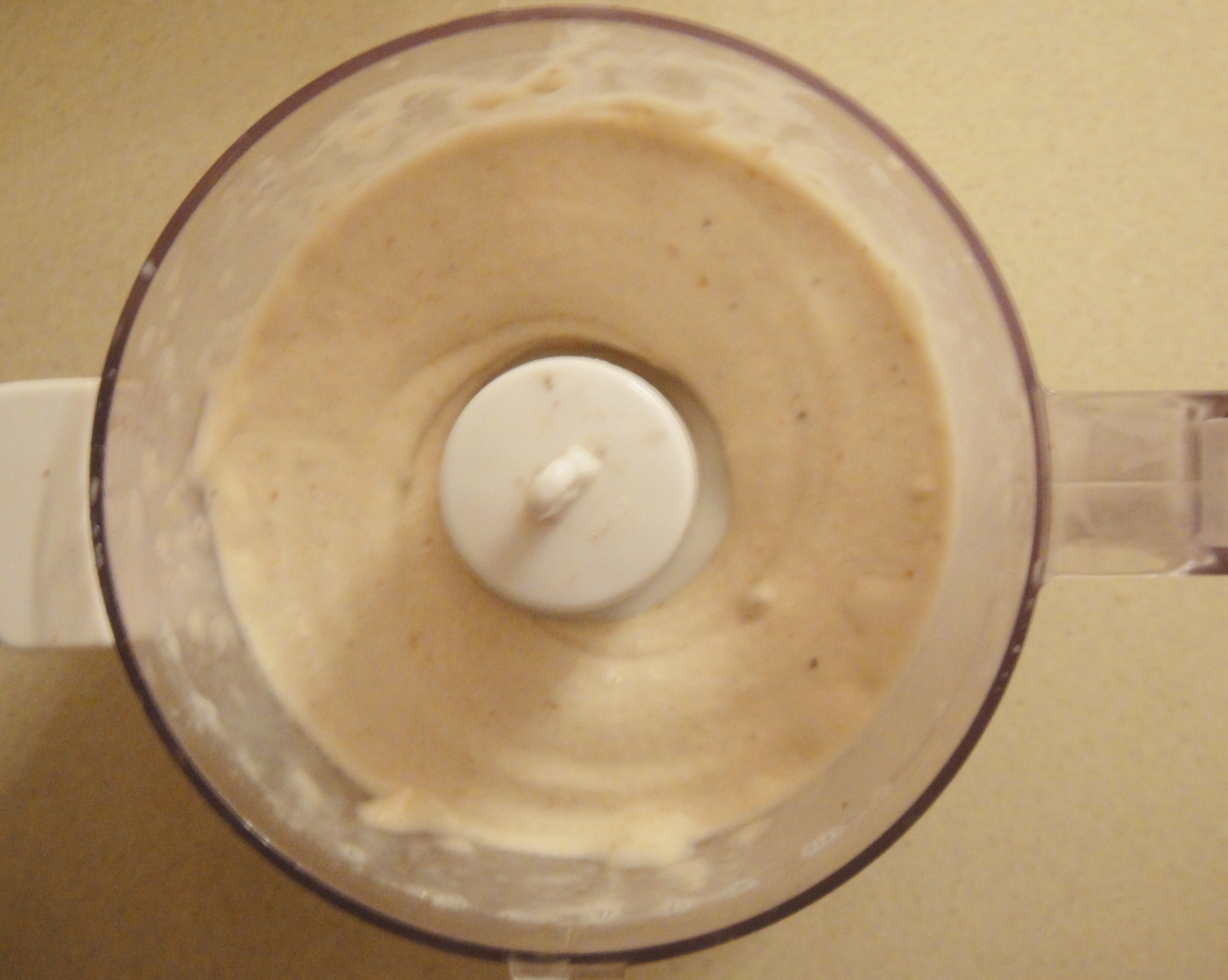 Step Two: Put the slices into the food processor and run it for around 30 seconds. Then, add a 1/2 tsp of vanilla extract and a 2-3 tbsp of milk and blend again until it has a lighter color and creamy texture.