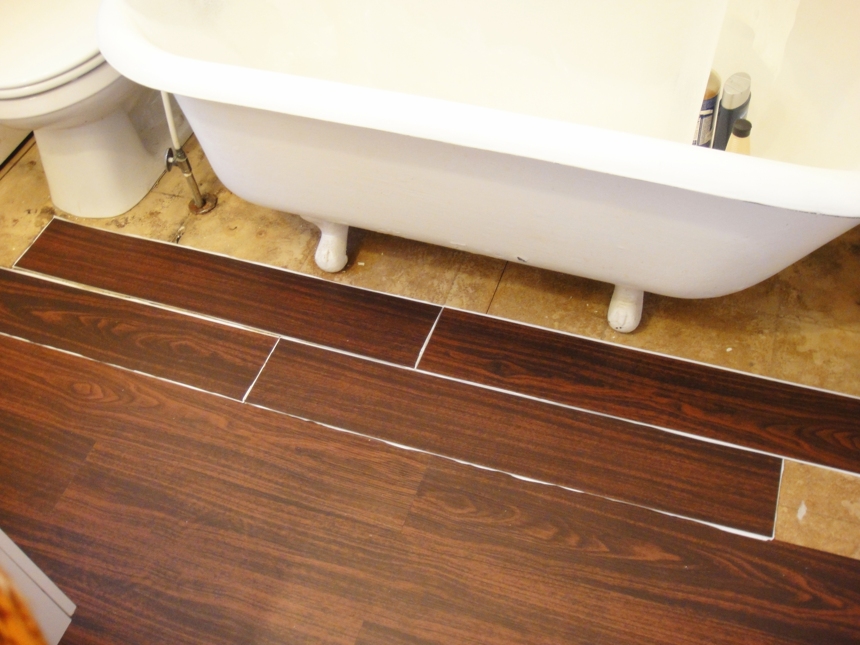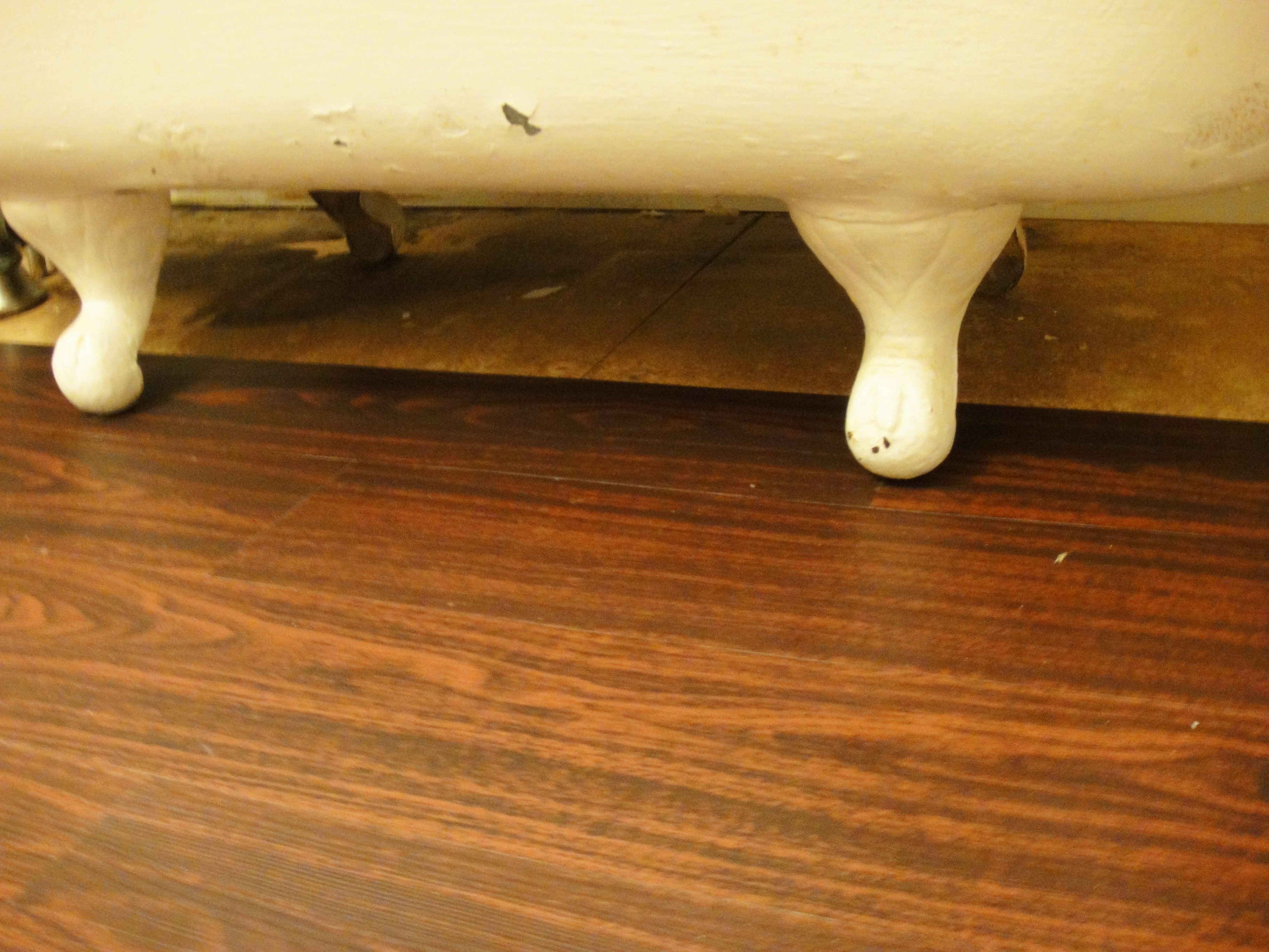 For the sections underneath the claw feet, my husband lifted the tub (after we measured, cut and dry fit the pieces) and I slid them into place.