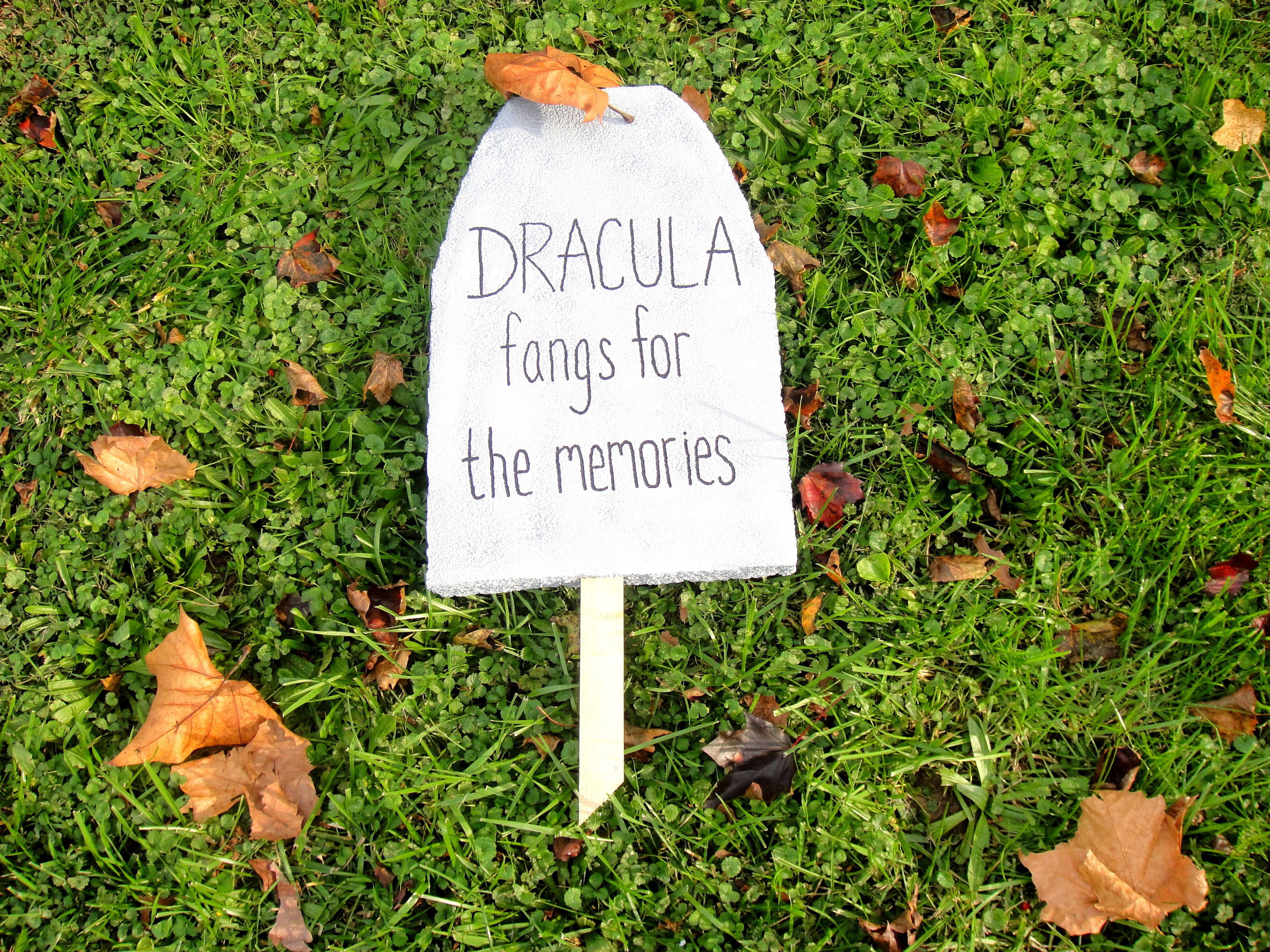 My husband cut pieces of wood in 8″ sections with one end on an angle to make the stakes a little easier to get into the ground. After digging out the hole, you can place your tombstones.