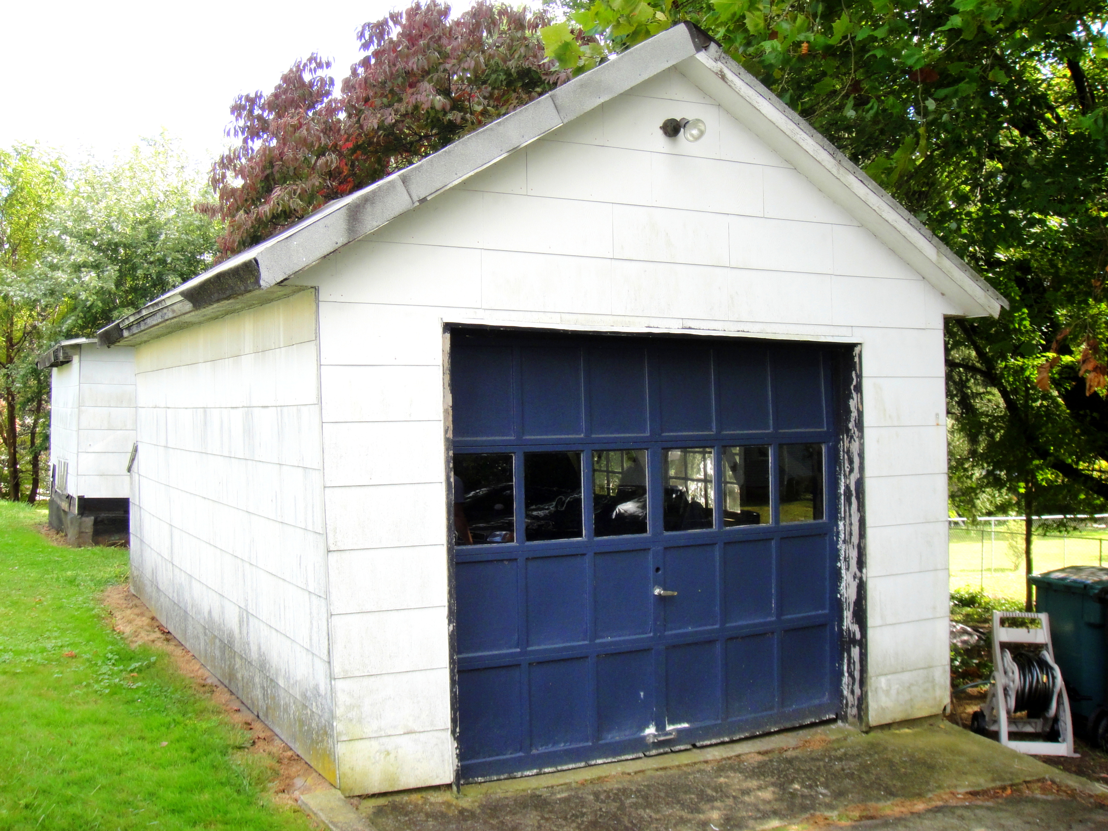 The major problem with this side is all of the mildew, dirt and mold. This side of the garage, along with the rest of it, required the brute force of a power washer. Here’s the building post-power washer: