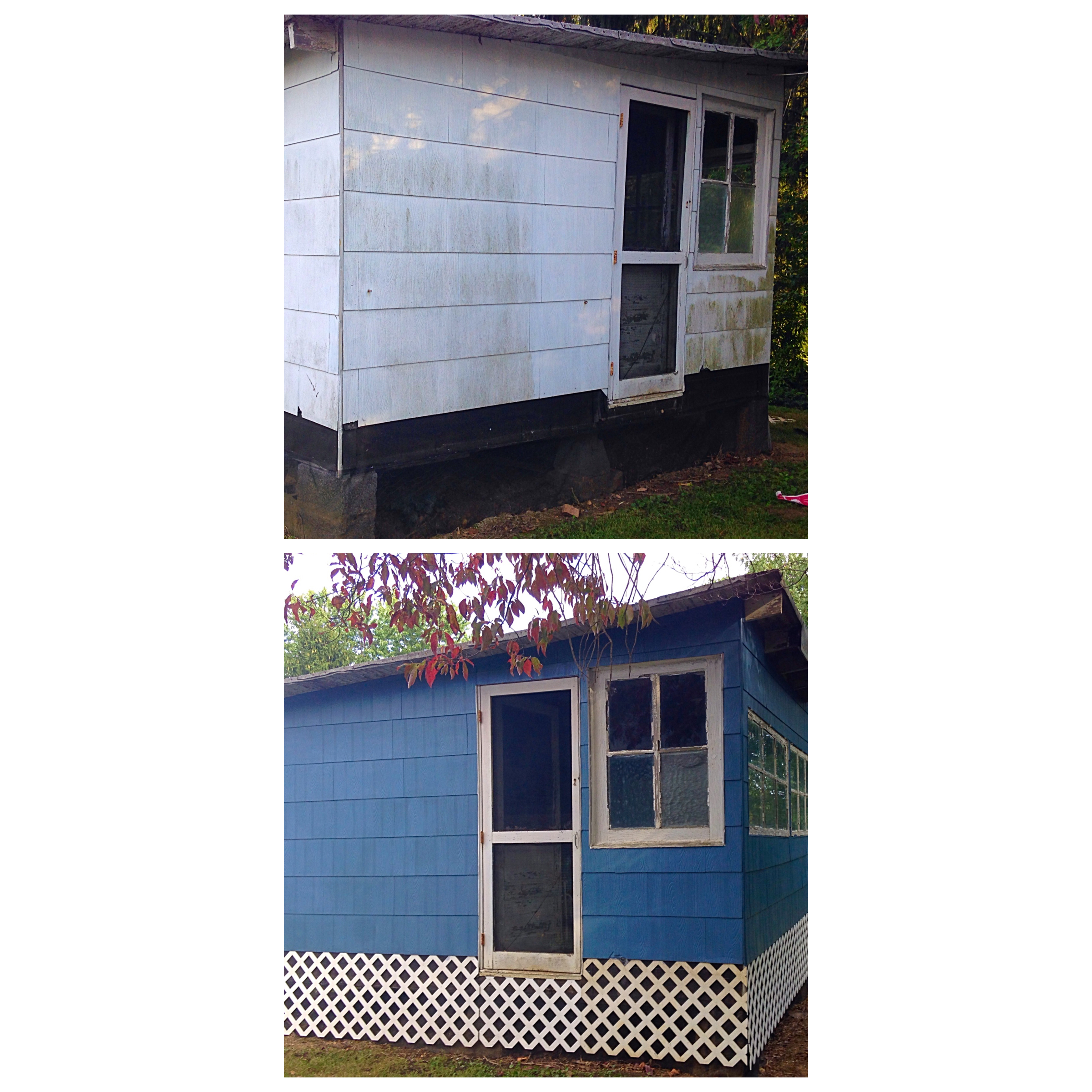 Once the lattice was finished, I went to work on prepping for paint. I began by caulking all of the holes, then I caulked all of the gaps in the siding. Then, I reshaped all of the pieces of siding that had chipped edges with, you guessed it, caulk. While all of this was curing, I tackled the mildew that had accumulated on the shady side of the coop.