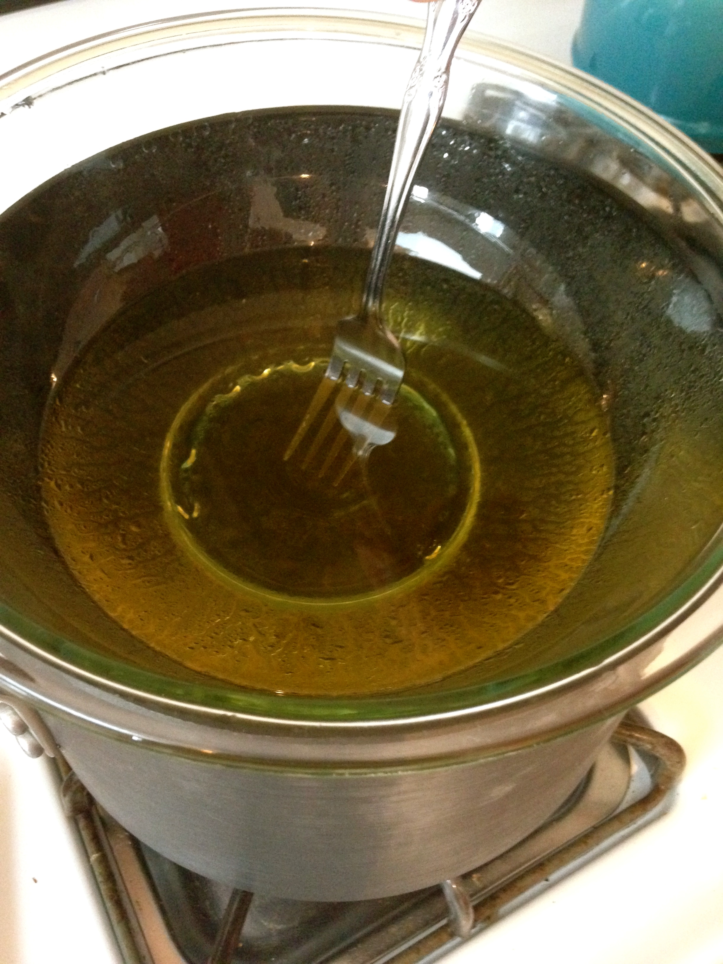 Around 10 minutes later, after pretty consistent stirring, you end up with a yellowish clear liquid. At this point, if you’re making a batch with just one scent, you can add your essential oils. I just added a few drops to individual bars to test scent strength and make the peppermint bars.